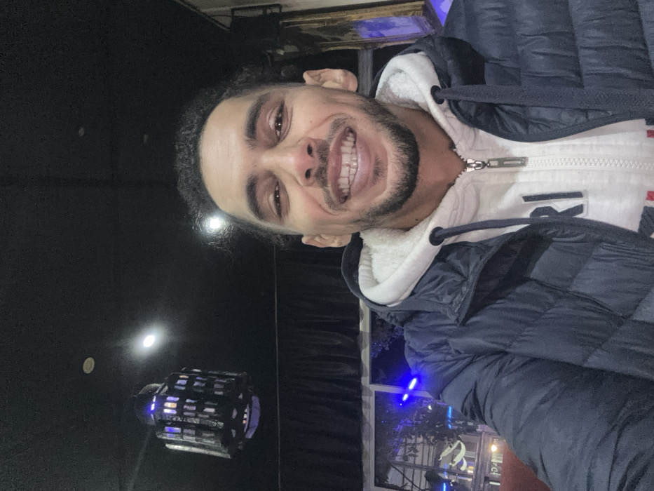 A man with curly hair and a short beard smiles at the camera while wearing a blue puffer jacket over a white hoodie. The background is dark, with a patterned lantern-like light fixture visible. Beyond a window behind the man, there are hints of trees and building lights. A second, softer light is also noticeable in the background, possibly from a distant street light.