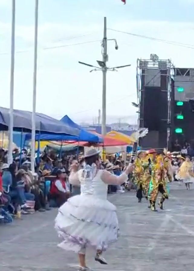 group of people dancing, likely as part of a celebration. Many of the dancers, predominantly men, are wearing colorful, ornate costumes, while some female dancers have on white dresses. One woman in a white dress is holding a decorative feather or staff. Spectators are seated along the side, some under blue tents. A large stage is in the background, with lights and a video screen. A flag is flying nearby on a tall pole. The setting appears to be an outdoor event on a paved surface.