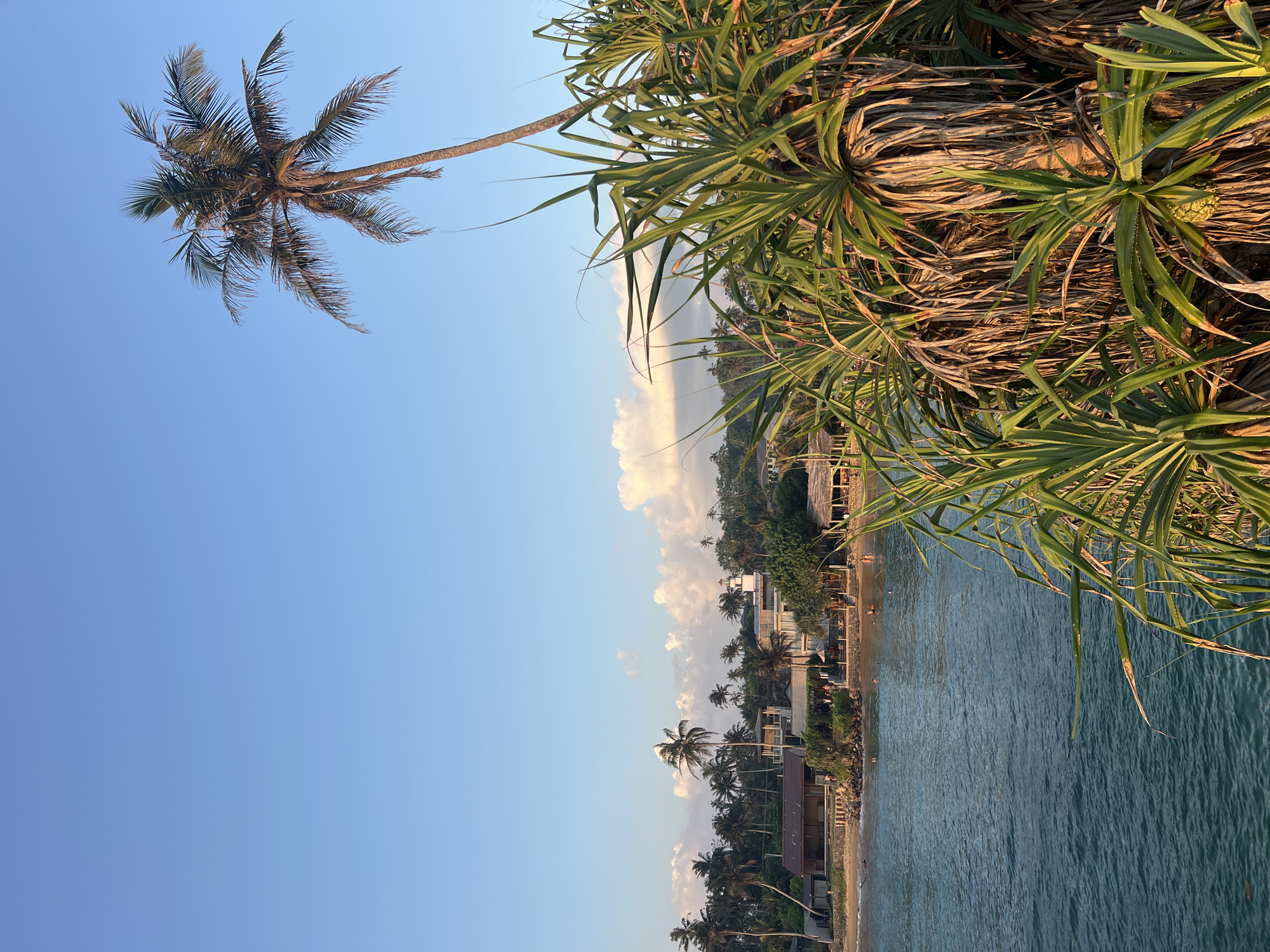 This image depicts a coastal scene in Goviyapana, Sri Lanka, during late afternoon or early evening, characterized by golden hour lighting. The sky is clear blue with scattered white cumulus clouds concentrated towards the horizon. In the lower-left, a calm, teal-colored body of water, likely the ocean or a bay, occupies approximately one-third of the frame. A sandy beach shoreline with some rocky sections extends along the middle ground, curving left to right. Dense, spiky, dark green foliage, consistent with Pandanus plants, fills the lower right foreground, illuminated by warm sunlight. A tall, slender palm tree with a slight lean rises from the mid-ground on the right, its fronds silhouetted against the sky. Numerous other palm trees, primarily coconut palms, populate the landmass along the beach and extend inland, forming a tropical canopy. Several buildings, appearing to be resorts or residential structures, are situated along the beachfront and further back. These include multi-story buildings with open-air elements and single-story structures with thatched or tiled roofs. A distinctive white building with a red conical roof, resembling a small lighthouse, is visible amidst the palm trees in the background on the left side of the landmass. Multiple individuals are visible in the water near the beach, engaged in swimming or wading. Other people are standing on the sandy beach near the structures. The overall scene portrays a tranquil, active coastal environment.