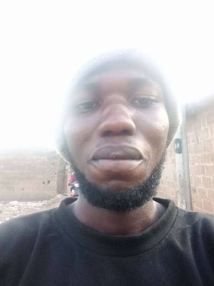 A dark-skinned adult male is presented in a close-up, front-facing portrait within the city of Toto, Nigeria