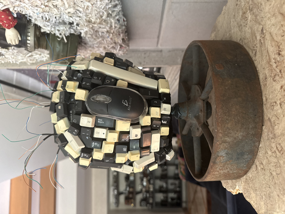 An unusual sculpture-like object features a sphere covered in white and black keyboard keys, including a black ELE-GATE mouse. Wires protrude from the key-covered surface. Connected to this is a rusted metal wheel with visible spokes, resting on a textured, light-colored surface. The entire creation stands next to a display of other objects, offering a glimpse into a cluttered or artistic space.