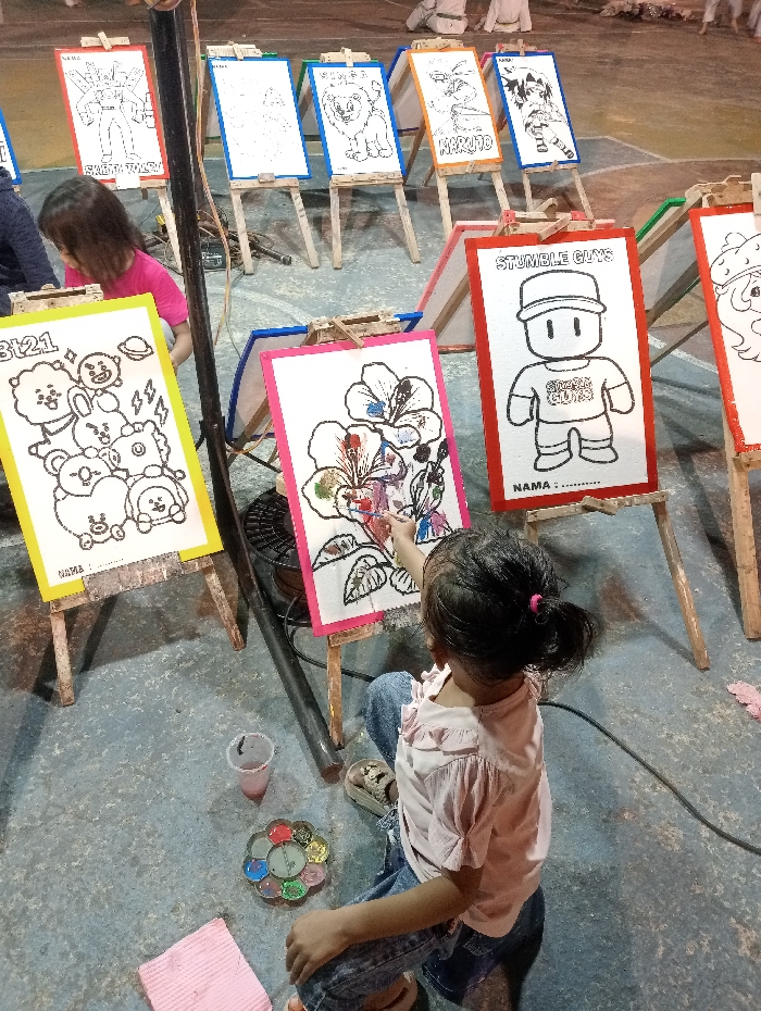 In Lhokseumawe, Indonesia, an indoor or nighttime outdoor children's coloring event is underway on a worn, possibly concrete or asphalt, surface. A young girl, seen from the rear, wearing a pink ruffled top and blue jeans, sits on the ground, actively painting a pre-outlined floral design on a wooden easel with a pink frame. Her right hand holds a paintbrush. Adjacent to her are a clear plastic cup containing a reddish liquid, a circular multi-color paint palette, and a small pink cloth. To the left, a second child in a pink shirt is partially visible, leaning over an easel displaying a "BT21" character outline on a yellow-framed canvas. Numerous other wooden easels line the background, each presenting a different pre-outlined drawing for coloring, including characters from "Stumble Guys" (red frame), "Simba" (blue frame), "Naruto" (orange frame), and "Sabito & Makomo" (red frame). The scene is illuminated by artificial light, casting shadows and highlighting the activity. Blurred figures are discernible in the distant background.