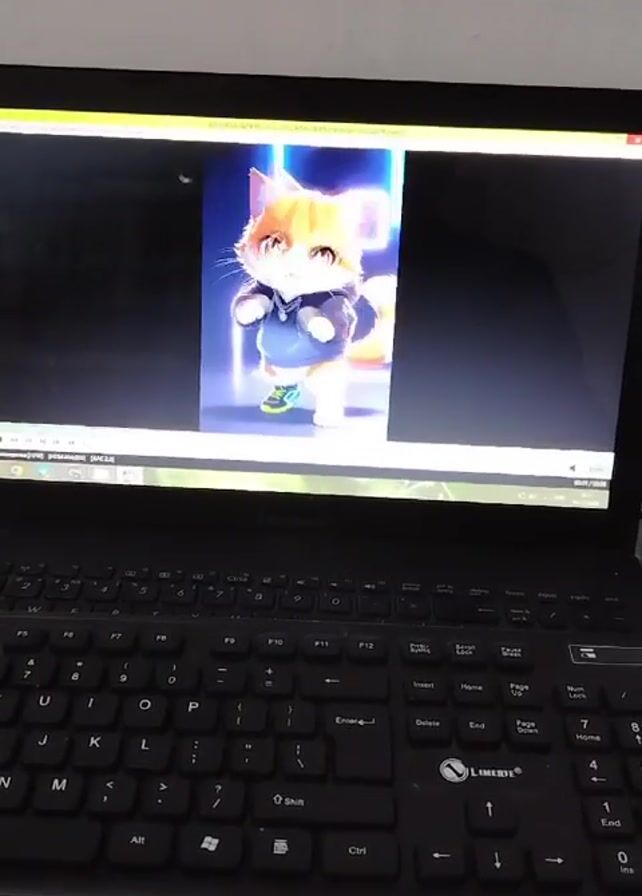 A video shows a laptop with an open media player, displaying an animation of a cat character
