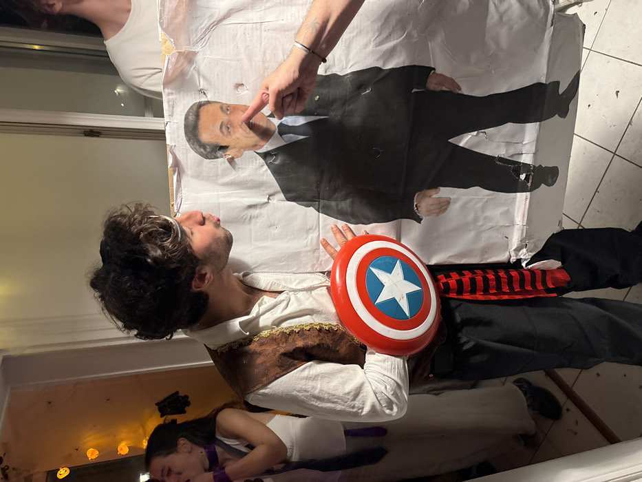 An indoor scene depicts a social gathering featuring three individuals and a cardboard cutout. A young adult male, positioned centrally, wears a pirate costume consisting of a white long-sleeve shirt, a brown vest with gold trim, black pants, and a red and black striped sash. He holds a small red, white, and blue Captain America shield in his left hand and has his lips pursed in a pouting gesture, directed towards a life-size cardboard cutout of Nicolas Sarkozy. The cutout shows signs of wear, including creasing and small holes, and is placed in the center-right of the frame. An unidentifiable person's right hand extends from the right, with the index finger touching the nose of the Sarkozy cutout. In the background on the left, a young adult female in a white top with purple accents is partially visible, appearing to drink from a container. Another male figure, wearing a white t-shirt, is partially visible in the upper right, standing behind the cutout. The environment features light-colored walls and flooring. String lights with orange-colored coverings and spider decorations are visible on the left wall, suggesting a festive, possibly Halloween-themed, atmosphere. The specific location within the city of Paris is not discernible from the image.