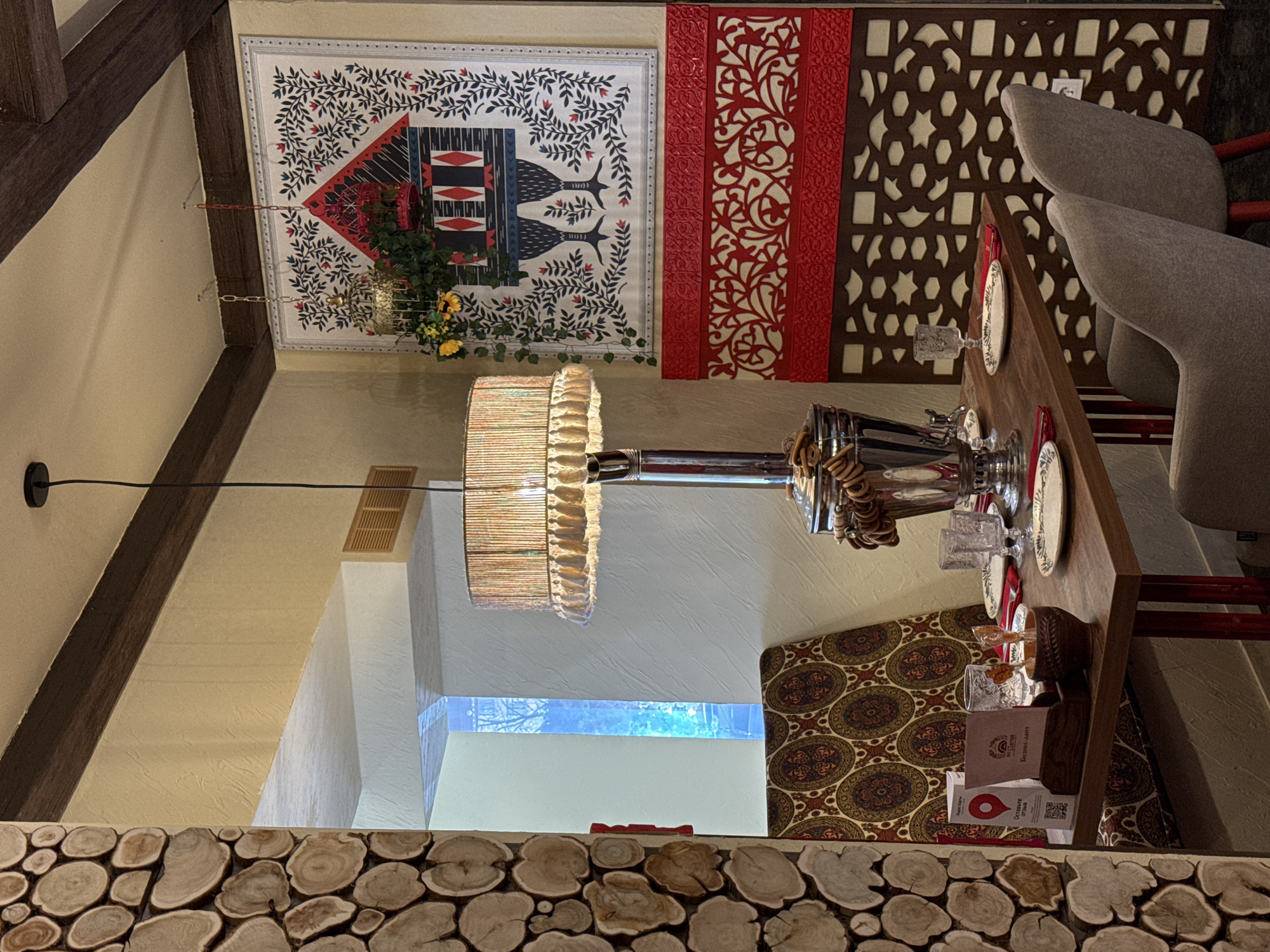 interior of a restaurant. A table is set with a samovar, plates, and glasses. Chairs are positioned around the table. Decorative wall art is visible in the background. There is a chandelier hanging from the ceiling. The restaurant appears to be decorated with wooden elements and has a cozy ambiance. The image is potentially from a restaurant in Donetsk, Ukraine.
