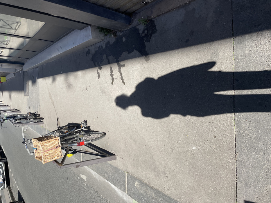 The image displays a sunny street scene in Paris, France. A human shadow, facing away from the viewer, is cast prominently across the concrete sidewalk from the bottom center. In the mid-ground, a silver-colored bicycle with a wicker basket mounted on its rear rack is parked at an angle, secured to a dark metal triangular bicycle rack. This bicycle also features a red taillight and a yellow reflector. Another bicycle is partially visible further down the sidewalk. To the left, an asphalt road borders the sidewalk, separated by a curb. A white vehicle with a French license plate (FV-365-ST) is parked on the road in the upper left background. To the right, a building facade with dark, reflective panels and a light-colored base runs along the sidewalk. Intense sunlight, likely from a low sun angle, creates sharp, elongated shadows, including a stark shadow line from the building running across the sidewalk. Small patches of green vegetation are visible at the base of the building.