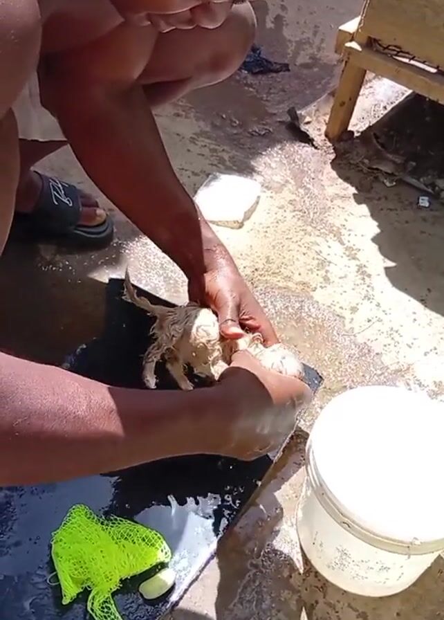 A dark-skinned, muscular person is cleaning a small animal, possibly a chicken or rabbit. The person is shirtless and squatting on a wet, possibly concrete surface, wearing gray sandals with an unknown logo. They are using both hands to clean the animal on a black cutting board. A green net bag and a white clove of garlic are on the cutting board. Next to the person is a white plastic bucket with a lid. The background shows a wooden structure resembling a rabbit hutch or chicken coop, with additional structures stacked on top. A blue plastic barrel is also visible. The scene is outdoors, with sunlight indicating it's daytime. The overall environment appears somewhat cluttered, with pieces of debris scattered around.