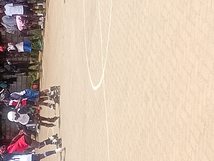 The image captures an outdoor scene at a paved court in Karingani ward, Kenya, featuring multiple individuals engaged in rollerblading activities