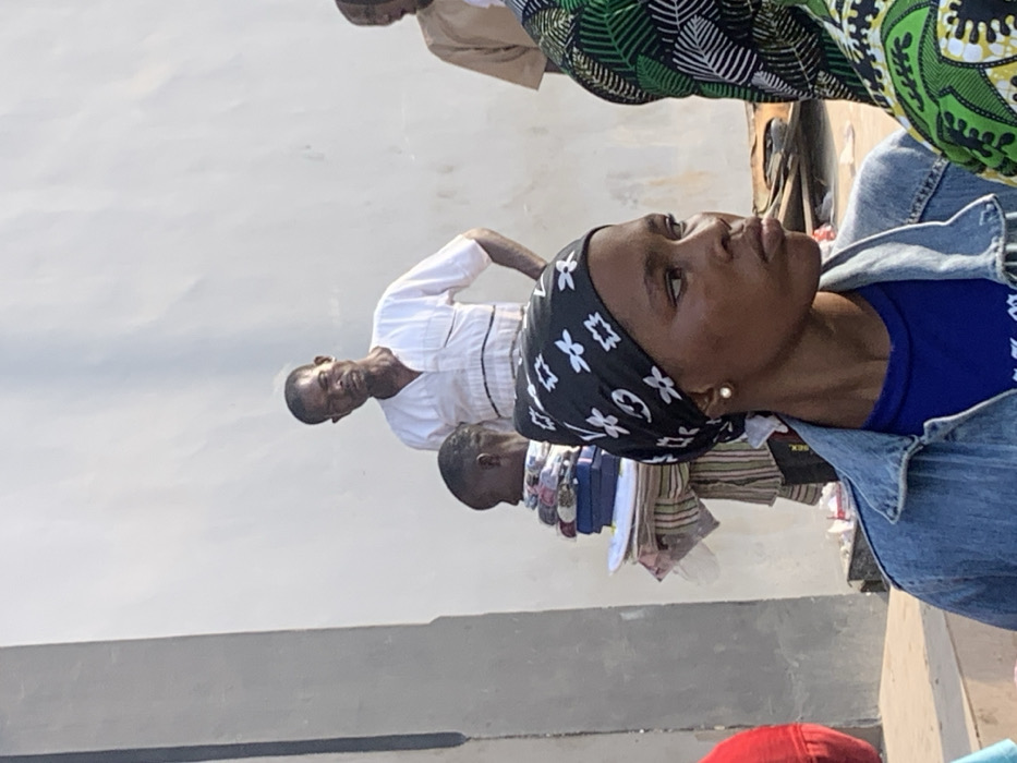 A woman in a black headscarf with white patterns, a blue shirt, and a denim jacket is in the foreground