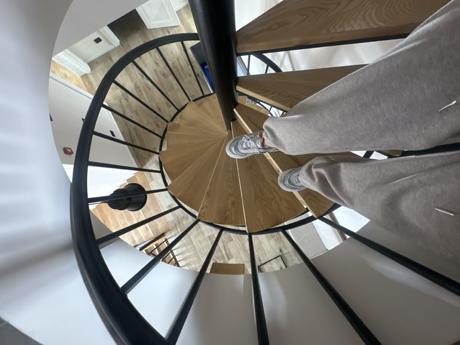 The image depicts a first-person, downward-facing view of a subject descending a modern spiral staircase within a building in Dilijan, Armenia