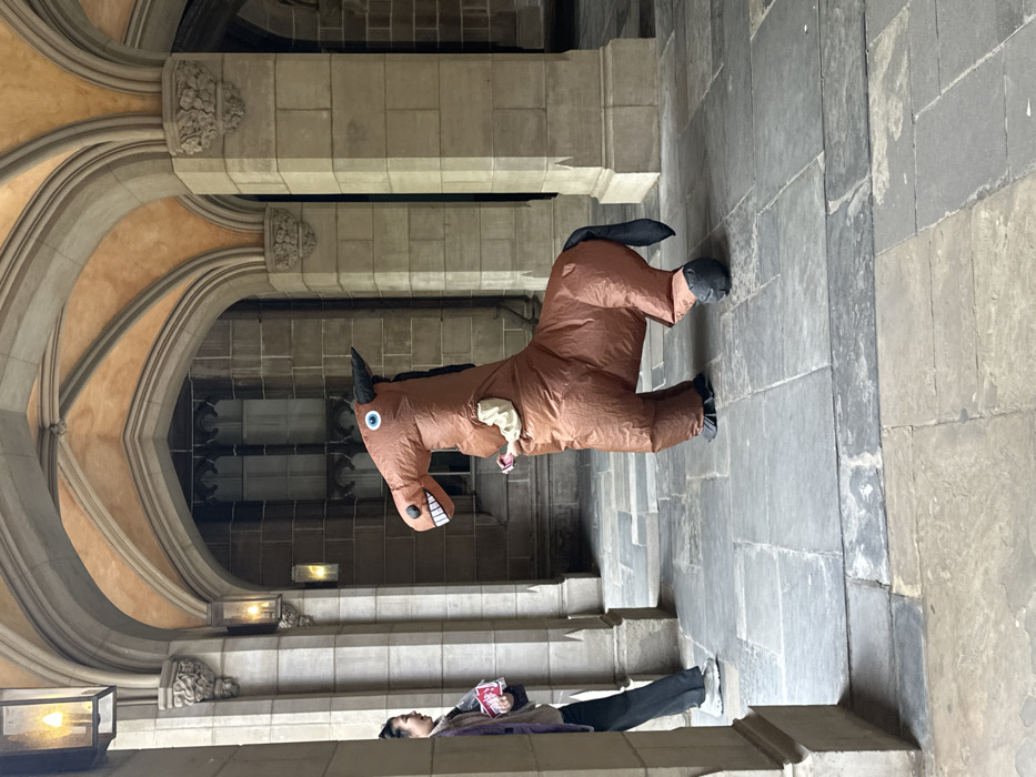 The image displays an arched stone passageway, likely a cloister, located on the University of Melbourne campus in Parkville, Australia. The architectural environment features light-colored stone columns, ribbed vaulted ceilings with orange-brown tinted arches, pointed arch windows with stone tracery visible in the background, and a floor paved with rectangular stone slabs. A central figure is an individual wearing a brown, inflatable, full-body horse costume. The costume is designed in a centaur-like configuration, with the wearer's torso forming the horse's body. The horse's head features caricatured blue eyes and prominent white teeth. The wearer's human arms, clad in a beige long-sleeved shirt, emerge from the costume's chest area; one hand grasps a small, indistinct pink object. Black hoof-like coverings are visible on the costume's feet, and a black tail extends from the rear. To the far left, a second individual is partially visible, leaning against a stone pillar. This person has dark hair, wears a light purple jacket over a darker top, dark trousers, and white sneakers. They are holding a small red item and appear to be facing towards the person in the horse costume. Two wall-mounted lanterns with frosted glass panels are affixed to the left wall.