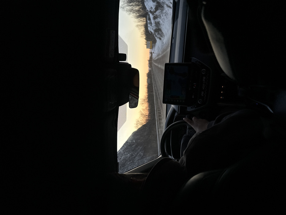 - "The image depicts the interior perspective from a vehicle, looking forward through the windshield, on a roadway in Lyngvær, Norway, during either sunrise or sunset" by FM-9gGO02, licensed under CC BY 4.0