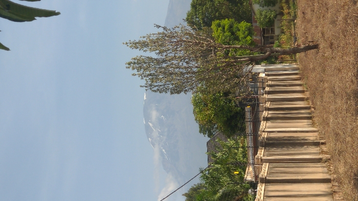 A pathway of evenly spaced steps climbs uphill toward a dense thicket of trees. A bare-branched tree arches over the walkway, its thin branches reaching toward a cloudy sky. A grassy field, dried brown from the sun, extends on the right side of the stairs. In the background, a partial view of a large, shadowed mountain is visible.