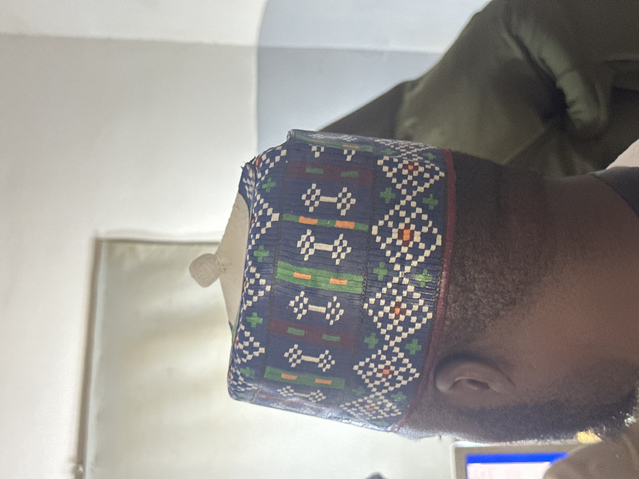 An indoor scene in Unguwar Rimi, Nigeria, captured from a rear perspective, focuses on an individual wearing a traditional, dark blue cap. The cap features intricate geometric patterns in white, light blue, green, and orange, with a distinctive light-colored knot at its apex and a reddish-brown trim along its lower edge. The individual's dark-toned skin is visible around the ear and the back of the head, showing short, dark hair and traces of facial hair along the jawline. To the immediate left, a portion of a glowing screen, possibly a computer monitor, displays blue and white light. The background consists primarily of a plain white wall, with a horizontal, slightly discolored rectangular area visible above the cap. To the right, a blurred section of dark olive-green fabric or garment is present. No explicit actions or interactions are discernible.