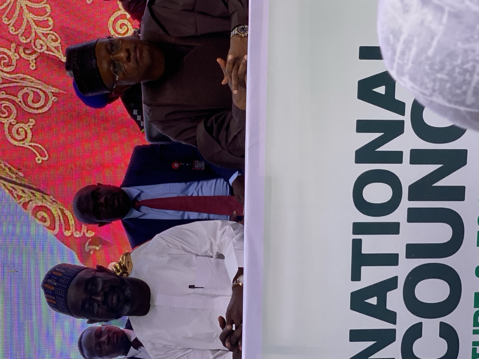 An indoor scene in Unguwar Sarki, Nigeria, depicts three men seated behind a white table draped with a white tablecloth. A partial view of a white banner with dark green letters, "NATIONAL COUNC," is visible below the table. In the immediate foreground, the top of a head wearing a white patterned cap is present. From left to right, the seated individuals are: 1. A male, estimated middle-aged, with dark skin, wearing black-framed glasses and a short dark beard. He is dressed in a white long-sleeved traditional Nigerian garment, with a black pen clipped into its breast pocket. He wears a multi-colored patterned cap and a gold-toned watch on his left wrist. His hands are clasped on the table, and he is looking slightly to his left. 2. A male, estimated young to middle-aged, with dark skin, positioned slightly behind the other two. He wears a dark blue suit jacket, a white shirt, and a red tie. An identification badge holder is clipped to his suit jacket on his right side. He is looking directly forward. 3. A male, estimated middle-aged, with dark skin, wearing dark-framed glasses and a dark, possibly brown or black, traditional Nigerian garment. He wears a matching dark cap. His hands are clasped on the table, and a silver-toned watch with a dark face is visible on his left wrist. He is looking directly forward. Behind the seated individuals, a large red screen or backdrop features intricate gold-colored swirling patterns. The lighting suggests an artificial indoor environment. The arrangement indicates a formal event such as a conference or meeting.
