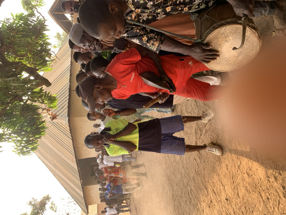 A gathering of people outside a building features men playing music. One man is beating a drum while another strikes what appears to be a pan with a stick. Several other men are standing in the background, watching. One man wears a neon yellow shirt and denim shorts, while another wears a red shirt with the word "CHOICE" printed on it. A few people in the distance wear school uniforms, suggesting it is a school event. A tree branch with green leaves is visible on the left.