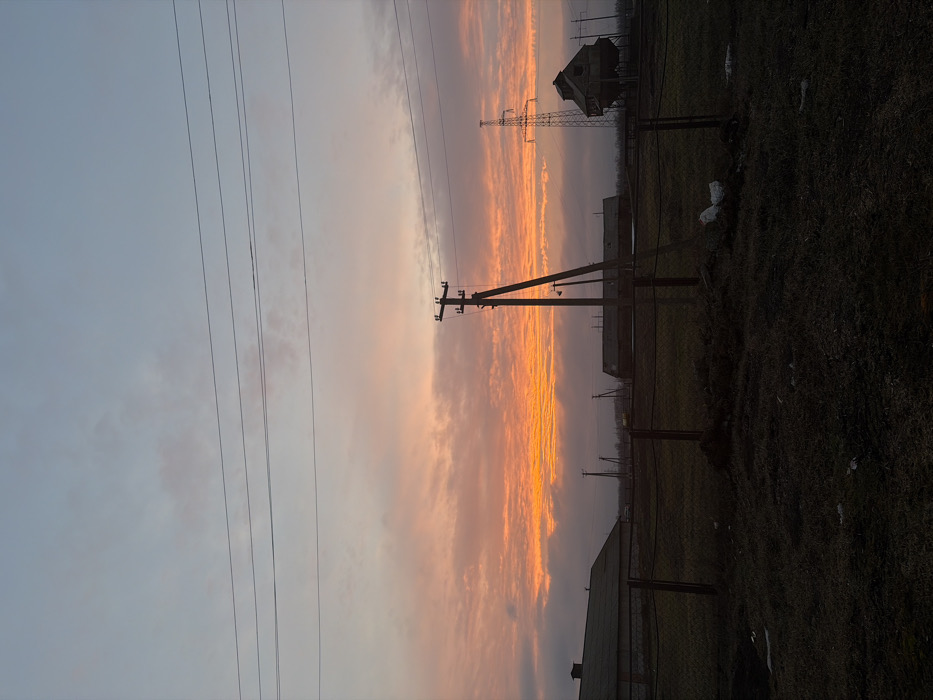 The image displays a rural or semi-rural landscape in Bessergenovka, Russia, at either sunrise or sunset. The sky occupies the upper two-thirds of the frame, showing a gradient from light blue-grey at the top to intense orange and yellow along the horizon, indicative of low sun illumination. Stratocumulus clouds are present, notably brightly lit near the horizon. Multiple dark utility lines stretch horizontally across the sky. The foreground consists of dark, sparse ground cover, primarily grass or weeds, appearing unkempt. A dark metal fence, possibly wire or chain-link, runs horizontally across the mid-ground. Behind the fence, a large clump of dark earth or debris is visible. To the right of center, a piece of white debris lies on the ground behind the fence. In the mid-ground, several utility poles are prominent. A large wooden utility pole with multiple crossarms and insulators stands slightly left of center, angled towards the right. Additional smaller utility poles are visible in the distance. Silhouetted against the bright sky are several buildings: to the left, a long, dark, single-story structure with a dark green, gently sloped roof is visible. Further right, another dark, single-story building is present. On the far right, a tall, dark metal lattice transmission tower stands against the horizon. Next to this tower, a distinct dark structure, possibly an elevated grain silo or water tower with a complex, weathered shape, is silhouetted. No individuals, actions, or specific interactions are discernible within the scene.