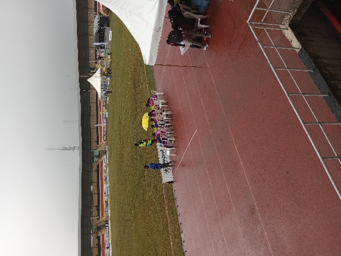The image displays Kinoru Stadium in Meru, Kenya, under an overcast sky. The red synthetic running track in the foreground is wet, indicating recent precipitation. The central playing field consists of muddy, sparse green grass. In the mid-ground, positioned on the running track to the left, a group of approximately ten individuals, appearing to be young athletes, are seated on white plastic chairs. They are uniformly dressed in pink or magenta tops with white sleeves and white shorts or trousers. An adult male in a yellow high-visibility vest stands behind this group, holding a yellow umbrella over them for shelter. Another individual in a blue top stands to the left of the seated group, next to a white banner with partially visible text. To the right, partially obscured by a large white event tent, several individuals are seated on white plastic chairs around a white table. Further across the muddy field, two additional white event tents and a stage-like structure are visible. The stadium's multi-tiered concrete stands, largely unoccupied, extend across the background. Two tall communication towers are visible against the pale, hazy sky beyond the stadium structure. A white metal railing in the lower foreground indicates an elevated viewing position.