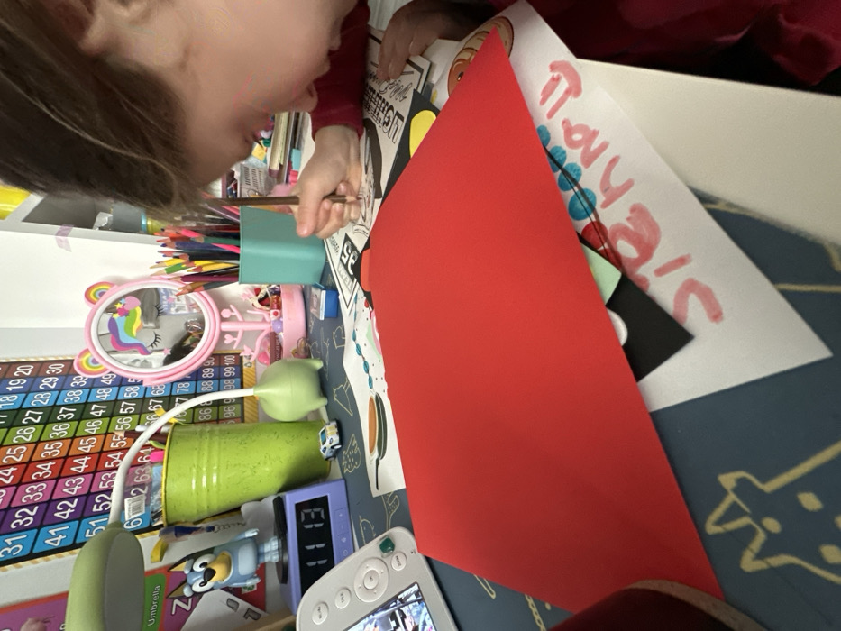 A child's activity desk, located within a residential property in Macclesfield, United Kingdom, is observed from an elevated angle. A young individual, wearing a dark pink long-sleeved top, is partially visible on the right, focused on a drawing task. Their right hand grasps a pencil, actively marking a white sheet of paper. The desk surface, patterned with blue and light yellow, is densely occupied. A prominent, uncreased rectangular sheet of red cardstock lies centrally in the foreground. Beneath it, a white sheet displays handwritten red text resembling "Thanks," while another sheet features a black-and-white illustration of a frying pan and a circular food item, indicative of a coloring page. On the left, a white remote control with a reflective screen sits on the desk. Adjacent to it, a purple digital alarm clock displays "11:13," topped by a light blue 'Bluey' character figurine. A tall, lime-green ribbed container stands behind the clock. Centrally, a light green mushroom-shaped desk lamp with a flexible white gooseneck illuminates the area. A small white toy car is positioned nearby. To the right, a pink unicorn-themed mirror with rainbow accents reflects an indistinct image. A turquoise container brimming with assorted colored pencils and markers is situated next to the mirror. The background shows a wall-mounted, multi-colored number chart ranging from 1 to 100.