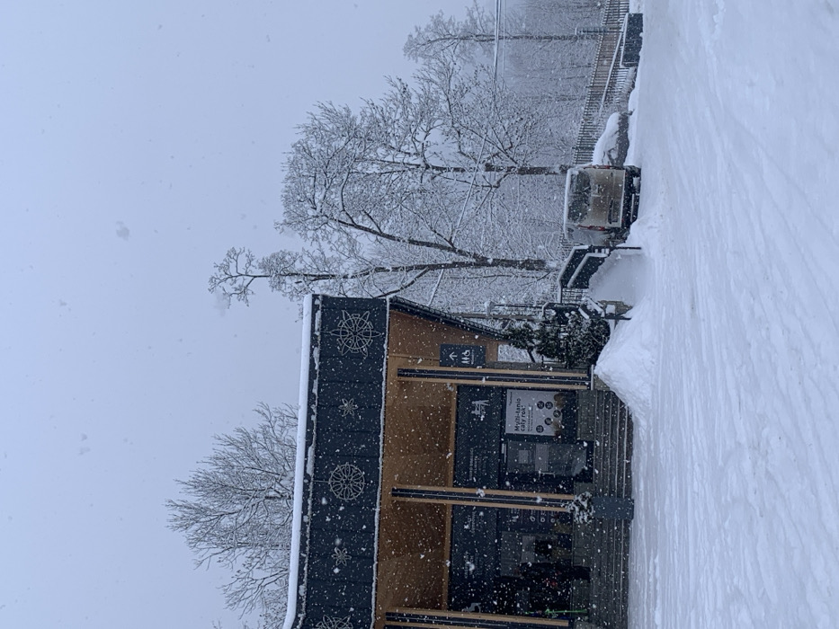 The image captures the Gubałówka Funicular Lower Station in Zakopane, Poland, during active snowfall. The entire visible ground surface, including steps, pathways, and distant terrain, is covered by a thick layer of white snow. Numerous individual snowflakes are discernible throughout the mid-air. The primary subject is a multi-story building with a dark, flat roof and a dark-toned upper facade adorned with multiple large, intricate white geometric patterns resembling snowflakes. Below this, a series of light-brown wooden pillars support a significant overhang. The ground floor features large glass doors and windows, revealing indistinct human figures within. Signage on the glass includes the Polish phrase "MYŚLI-TAŃCZY CAŁY ROK" and universal accessibility pictograms (wheelchair, male, female). Dark, cylindrical planters containing small plants are positioned on the snow-covered entrance steps and at the building's base. To the right of the building, a small, conical evergreen tree with lights is nestled against a snowdrift. A light-colored panel van is parked on a snow-covered paved area to the right of the building, partially obscured by a snow mound. A dark metal railing follows the contour of a descending snow-covered path or ramp adjacent to the parked vehicle. The background consists of numerous deciduous trees, bare of leaves and heavily laden with snow, ascending a gentle slope under a uniformly overcast, light-grey sky. No individuals are observed outdoors in the scene.