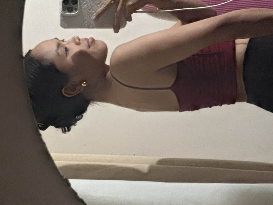 The image displays a woman taking a mirror selfie in an indoor setting, located in Davao City, Philippines. The subject is a woman with dark hair pulled back, wearing small gold hoop earrings. She is dressed in a maroon ruched spaghetti-strap camisole top and dark-colored pants. Her right hand, partially visible, holds a silver smartphone, likely an iPhone with a triple camera array and a textured white case, positioned to capture her reflection. The woman is angled with her right shoulder towards the viewer, turning her head slightly to her left, gazing at her reflection with a subtle smile. The background, as reflected in the mirror, shows a plain light-colored wall and a vertical light-brown structural element, possibly a doorframe or partition, on the left side of the frame. The lighting suggests an artificial indoor light source.