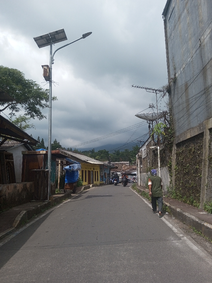 A street scene in Zeyathiri District, Myanmar, is depicted under an overcast sky with dark grey clouds. The asphalt road, which narrows and curves slightly to the left, occupies the center. On the right side of the road, an adult male, wearing a green t-shirt, dark trousers, and a blue head covering, walks away from the camera. A light-colored patch is visible on his right upper arm. He walks along a concrete curb next to a tall, textured concrete wall extensively covered in green vegetation. On the left side of the road, a concrete curb borders an area with several single-story structures, some featuring corrugated metal roofs. One structure has a blue tarp draped over an object, and a wooden cart is positioned nearby. A tall metal pole with a solar panel array and a street light fixture is prominent on the left, with a rectangular control box attached below the solar panel. Further down the street in the midground, multiple individuals on motorcycles are observed heading towards the camera. On the right, a multi-story building with a grey, weathered facade rises, hosting several television antennas and a satellite dish near its top. Overhead, electrical wires traverse the scene. The background reveals dense green foliage and distant mountains beneath the cloudy sky.