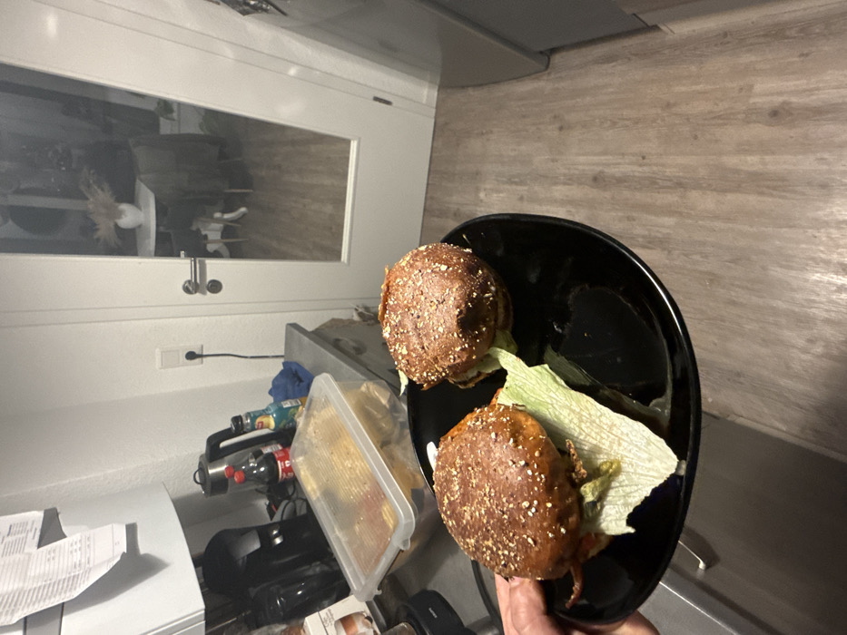 Two seeded burgers sit on a black plate with green lettuce. The background includes a silver countertop, a white window reflecting a blurred scene, and a wall with wood-like paneling. Underneath the plate is an array of items, including a plastic container, bottles, and papers. The scene appears to be indoors, likely a kitchen area.