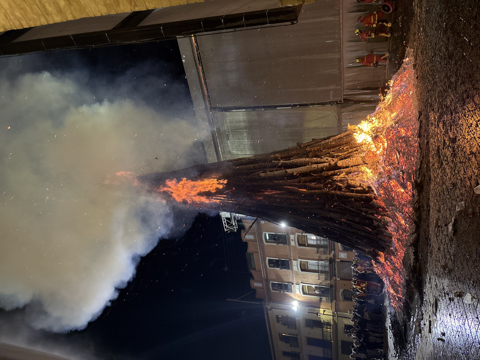 A large bonfire of logs blazes at night in an urban setting. Flames engulf the base of the structure, emitting sparks and smoke. A building is visible in the background. Firefighters stand near the top. A crowd watches from behind a barrier. The image is oriented in an unusual way, with the bottom of the picture pointing to the right.