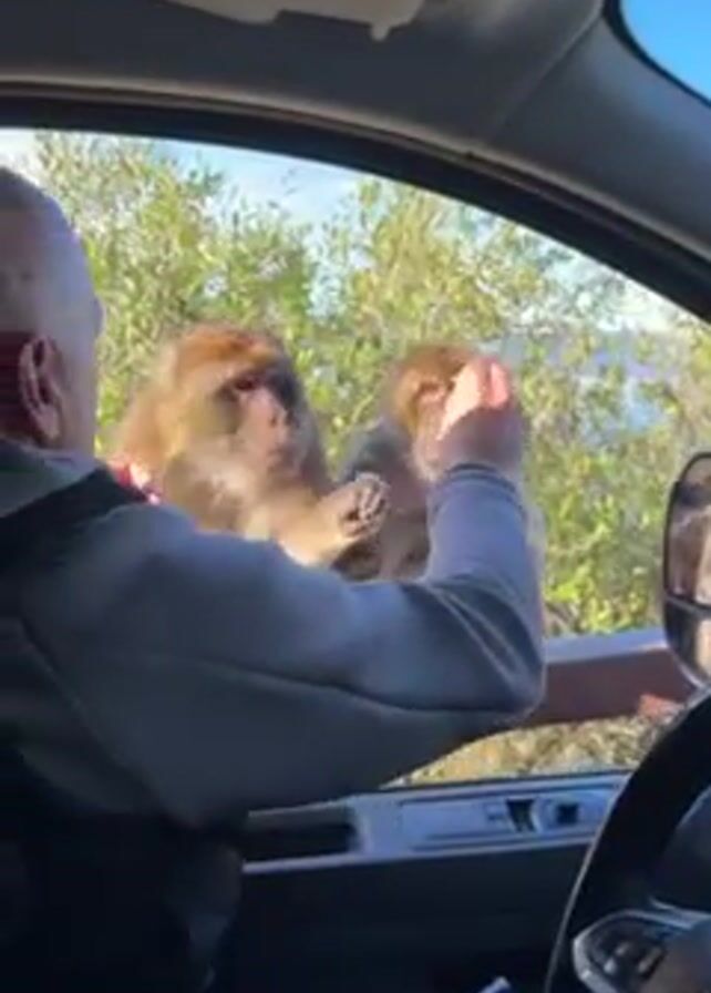 interior of a car, focused on a driver feeding two Barbary macaques outside the window