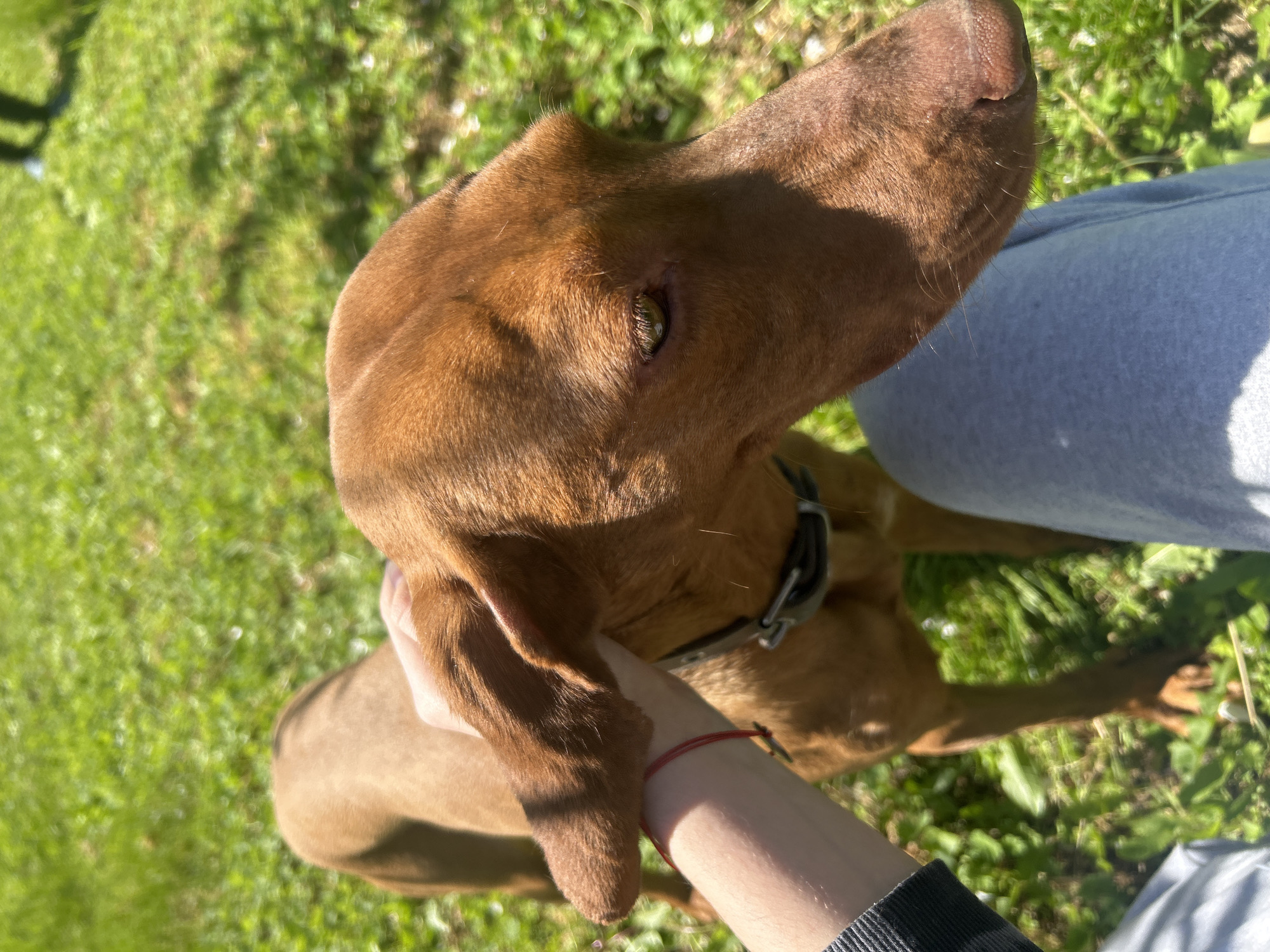 - "A medium-shot, high-angle photograph shows a Vizsla dog outdoors, likely in Gorsko Ablanovo, Bulgaria" by FM-h4TRP2, licensed under CC BY 4.0