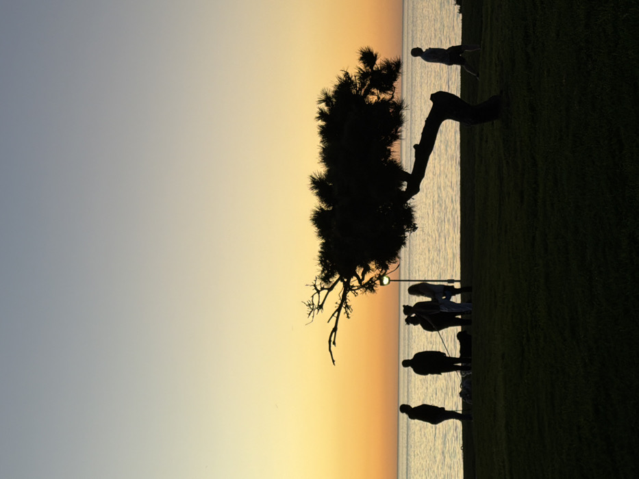 Silhouetted figures walk along a grassy bank by the sea at sunset. A solitary, leaning tree dominates the scene, its dark form contrasting with the vibrant gradient of the sky. People and dogs are visible along the shoreline and on the grass. The water reflects the colors of the sunset, creating a peaceful, dusky ambiance.