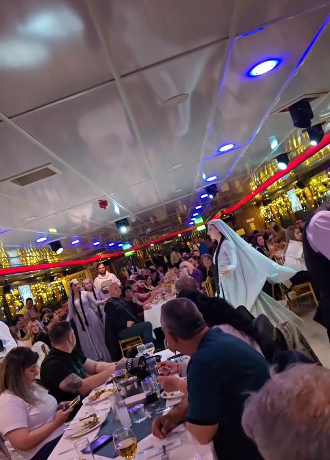 scene inside a boat packed with people sitting at tables and watching a performance. There are waitstaff dressed in black vests navigating the aisles. Performers in traditional light-colored costumes are dancing in the aisle between the tables. Most of the audience members are seated, many eating or drinking, and some watching the performance. The boat's interior is brightly lit with a mirrored ceiling reflecting the overhead lights and festive decorations. The overall impression is that of a dinner cruise with entertainment.
