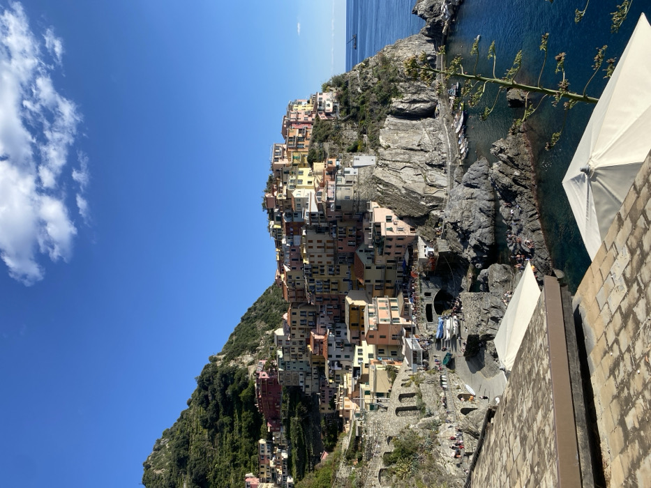 This image depicts a panoramic view of Manarola, Italy, a coastal town situated in the Cinque Terre region. The scene is captured from an elevated vantage point, looking down and across the densely built town and its harbor, extending towards the Ligurian Sea under a clear blue sky with scattered white clouds. The town occupies a steep, verdant hillside and a prominent rocky promontory extending into the sea. Structures consist of multistoried buildings characterized by brightly colored facades in shades of yellow, pink, orange, green, and terracotta, tightly packed and built directly onto the cliff face. Terraced cultivation is visible on the upper parts of the hillside behind the main cluster of buildings. At the base of the cliffs, a small, rocky cove serves as a harbor. Several small boats, primarily light-colored, are visible either docked in the water or pulled onto the rocky shore and paved areas. A series of arched stone structures form a pathway or tunnels along the waterfront. Numerous individuals are present throughout the lower sections of the town, particularly congregated on the paved and rocky areas near the water, suggesting pedestrian activity. A larger vessel is discernible on the distant horizon of the sea. In the immediate foreground, a textured, tiled rooftop surface extends from the lower left to the lower center. Two large, light-colored patio umbrellas are partially visible in the lower right corner, indicating an outdoor seating area below the camera's position. A tall, slender plant with green foliage rises vertically on the far right, partially framing the seascape. The scene is illuminated by strong sunlight, producing distinct shadows.