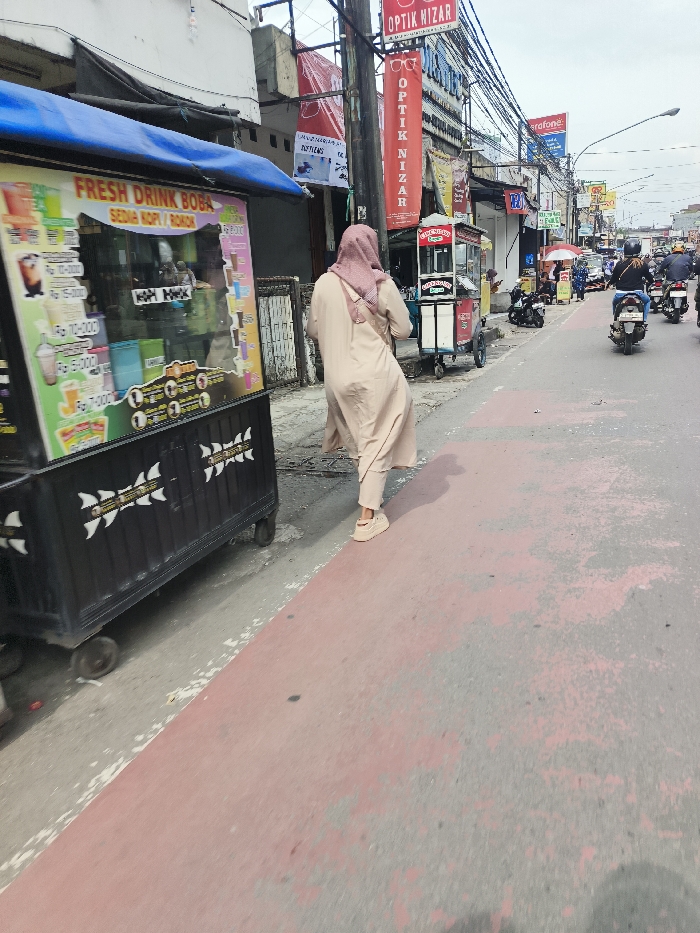 A forensic examination of the image reveals an urban street scene in Cimahi, Indonesia, on an overcast day. In the immediate foreground, a person is observed from behind, walking rightward on a raised, reddish-pink pavement strip. This individual wears a light tan or beige long tunic over matching trousers and shoes, complemented by a light pink hijab. To the left, a black mobile vendor cart with a blue canopy and four wheels is stationary. Its prominent sign advertises "FRESH DRINK BOBA" and other beverages with associated prices. The cart's side features white arrow-shaped decals. Beyond the pedestrian and cart, the street is lined with commercial buildings. Multiple vertical red banners displaying "OPTIK NIZAR" are prominently affixed to a utility pole and building facades on the right. Another, smaller vendor cart is visible further down the street on the left. The asphalt roadway occupies the right side of the frame, accommodating multiple motorcycles, each with at least one rider, moving away from the camera. Overhead, a dense array of electrical wires crisscrosses the sky, supported by utility poles. The environment is consistent with a bustling commercial district, characterized by pedestrian activity, street vendors, and vehicular traffic under a bright, diffused sky.