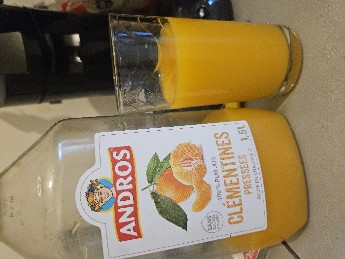 This scene, located in a residential setting within Villeneuve-Saint-Georges, France, depicts a clear plastic 1.5-liter bottle of Andros "Clémentines Pressées" (pressed clementine juice) positioned next to a clear glass tumbler filled with the same orange-colored juice. The bottle's label, featuring the "ANDROS" brand name, a figure with a fruit crown, and an illustration of whole and peeled clementines, indicates "100% PUR JUS" (100% pure juice), "SANS SUCRES AJOUTÉS" (no added sugars), and "RICHE EN VITAMINE C" (rich in Vitamin C). The bottle is approximately one-third full, while the glass is nearly full to the rim. Both objects rest on a light-colored, possibly tiled or laminated, countertop. In the blurred background, a dark-colored kitchen appliance, possibly a coffee maker, is visible. The immediate environment suggests an indoor kitchen or dining area.