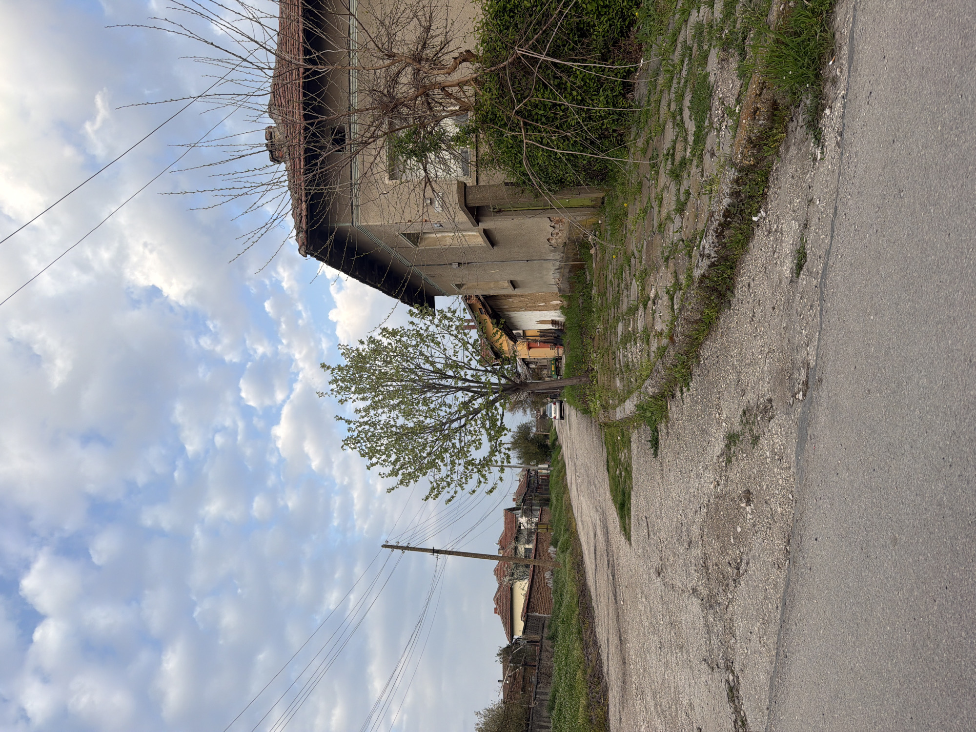 A street scene in Dolni Dabnik, Bulgaria features an aging asphalt road, cracked and separating from a raised stone sidewalk. A weathered, two-story building stands adjacent to the sidewalk, its facade appearing deteriorated with a mix of concrete and brick elements. Some vegetation, including overgrown grass and climbing vines, obscures parts of the building. Overhead electrical wires are visible against a cloudy sky. A tree, partially in bloom, stands further down the street, and other buildings with red-tiled roofs are visible in the distance. A parked vehicle is discernible on the street.