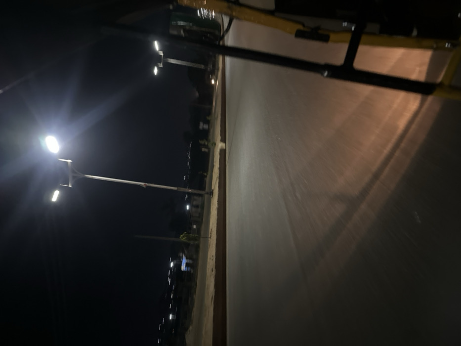 A night scene captures a street illuminated by bright streetlights. The camera appears to be positioned low, near the ground, with a portion of a yellow and black object visible in the foreground. The asphalt road stretches into the distance, reflecting the ambient light. Buildings and vegetation line the roadside, partially visible in the darkness. The overall image has a grainy quality, characteristic of low-light photography.