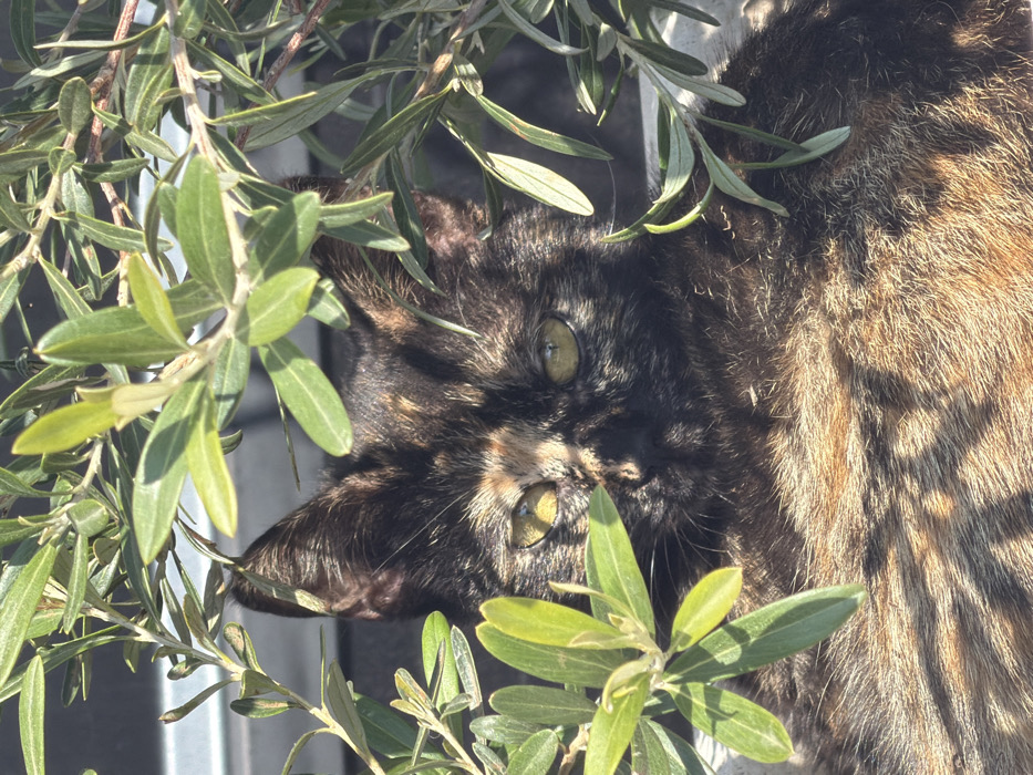 A tortoiseshell cat, exhibiting black, dark brown, and orange fur patterns, is observed resting outdoors in Bar, Montenegro. The cat's head is central to the frame, with its yellow-green eyes directed forward. Strong sunlight illuminates the scene, creating highlights on the cat's left eye and parts of its face, while casting shadows that accentuate its facial features and fur texture. Both pointed ears are visible, dark brown in color. The upper body of the cat is visible, showing its distinct fur pattern. The animal is partially obscured by dense foliage composed of numerous small, elongated, light green leaves and branches, suggestive of an olive tree or similar plant. These leaves are prominent in the foreground and surround the cat's head, with some creating dappled shadows on its fur. The background is indistinct and appears to be a light-colored, possibly concrete or plastered, surface. No other subjects or actions are depicted. The cat maintains a direct, watchful gaze.