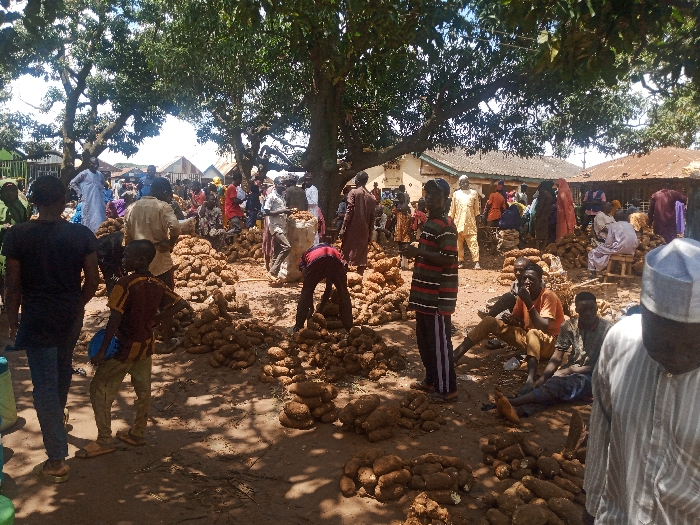- "This image depicts a bustling open-air yam market in Zangon Aya, Nigeria, under bright daylight with significant shade cast by large, leafy trees" by FM-ZuY702, licensed under CC BY 4.0
