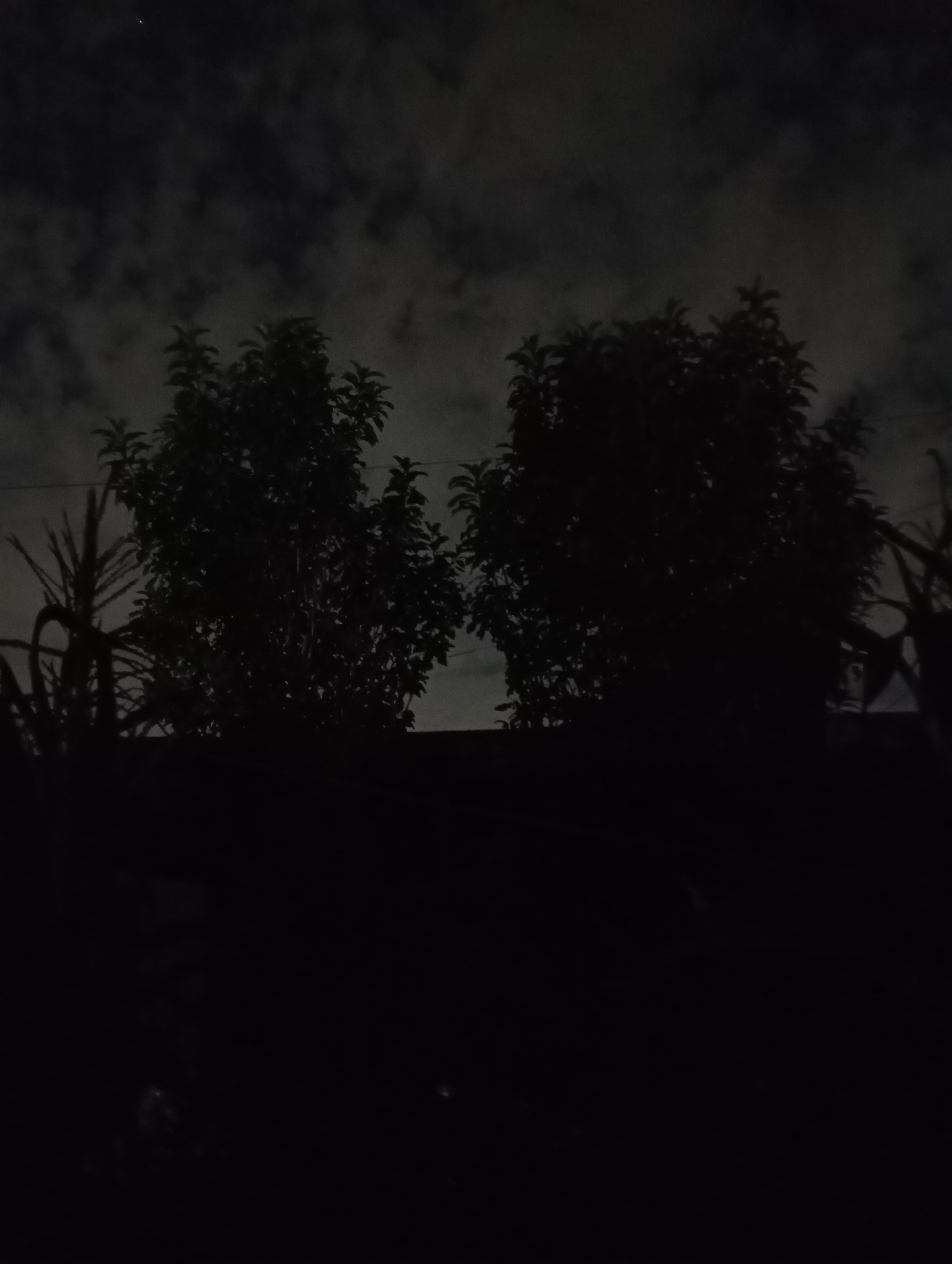 This image depicts an outdoor nighttime scene in what is identified as Johannesburg, South Africa. The upper half of the frame shows a dark, overcast sky with discernible cloud formations. A faint, singular point of light, possibly a star or distant artificial source, is visible in the upper-left quadrant. Below the sky, two prominent, densely foliated trees appear as dark silhouettes, centrally positioned against the lighter clouds. To the left of these trees, a tall, slender plant consistent with maize (corn) is partially visible in silhouette. To the right, another plant with upward-reaching, spiky leaves is partially observable. A faint, slightly lighter horizontal line traverses the mid-section of the image, suggesting a wall or boundary. The lower half of the image is characterized by deep, undifferentiated darkness, obscuring any foreground details. No people, specific objects beyond vegetation, or discernible actions or interactions are visible. The scene is illuminated by ambient low light, creating stark contrasts and silhouettes.