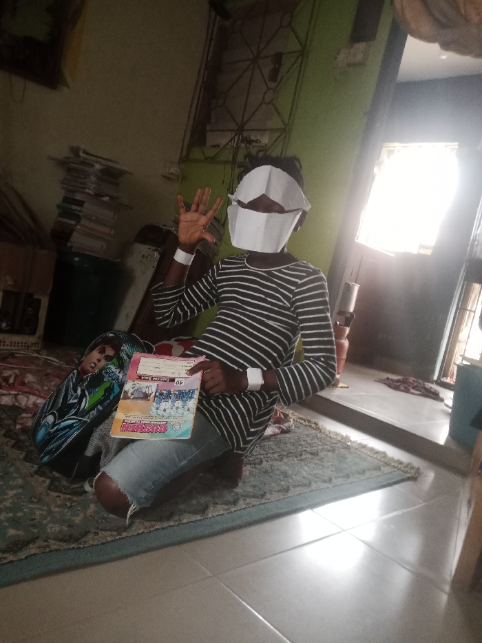The image depicts a single individual, possibly a child or young person, kneeling on a patterned rug within a room in Ikorodu, Nigeria. The person wears a homemade white paper mask obscuring the entire face, a long-sleeved horizontally striped (black and white) shirt, and light blue ripped denim knee-length shorts. White paper-like bands are visible on both wrists. The individual's left hand is raised, palm open, fingers splayed. The right hand holds an open exercise book titled "CREATIVE BOOK" with "40" prominently displayed and an image depicting a football team, possibly from "UNIRED INTERNATIONAL SCHOOL." A black and blue backpack featuring a cartoon character design rests on the rug beside the person's left knee. The room has light green painted walls. In the background to the left, a tall stack of books or papers is visible, alongside what appears to be a dark container. Metal grates are visible on the wall behind the individual. To the right, a bright, sunlit doorway or window creates a strong glare, illuminating a portion of the light-colored tiled floor. A small, dark red rug is present near the doorway. A metallic cylinder is partially visible in the vicinity of the doorway. The individual is barefoot.