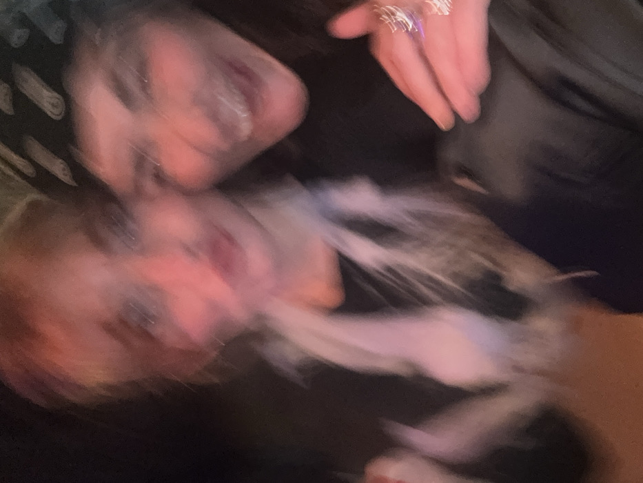 This severely blurred image depicts two young individuals in close proximity, likely in an indoor, low-light environment within the city of Lattes, France. The individual on the left has light-colored hair, possibly blonde or with light streaks, and is wearing a dark top. Their face, oriented towards the camera, shows eyes partially open and lips slightly parted in what appears to be a subtle expression or pout. The individual on the right has dark hair, covered by a dark bandana with lighter, possibly white or silver, patterns. This person is smiling broadly with an open mouth, revealing teeth. Their right hand is prominent in the foreground, adorned with multiple silver-toned rings of varying designs on the index and middle fingers. This individual is also wearing a dark top. The two individuals are positioned intimately close, suggesting a personal interaction. The background is uniformly dark and out of focus, with an ambient reddish-pink hue cast over the subjects, indicative of artificial lighting in a venue such as a club or bar.