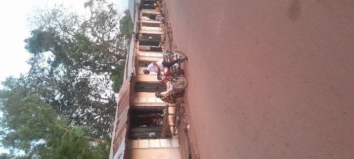 A street scene with a building on the left, featuring a rusty corrugated metal roof and faded walls. Two people are next to a red motorcycle parked in front of the building. One person is seated on the motorcycle, while the other stands beside it. The road occupies a significant portion of the right side of the image, appearing reddish-brown. A large tree with dense foliage is visible on the left, extending above the building. The sky is overcast.