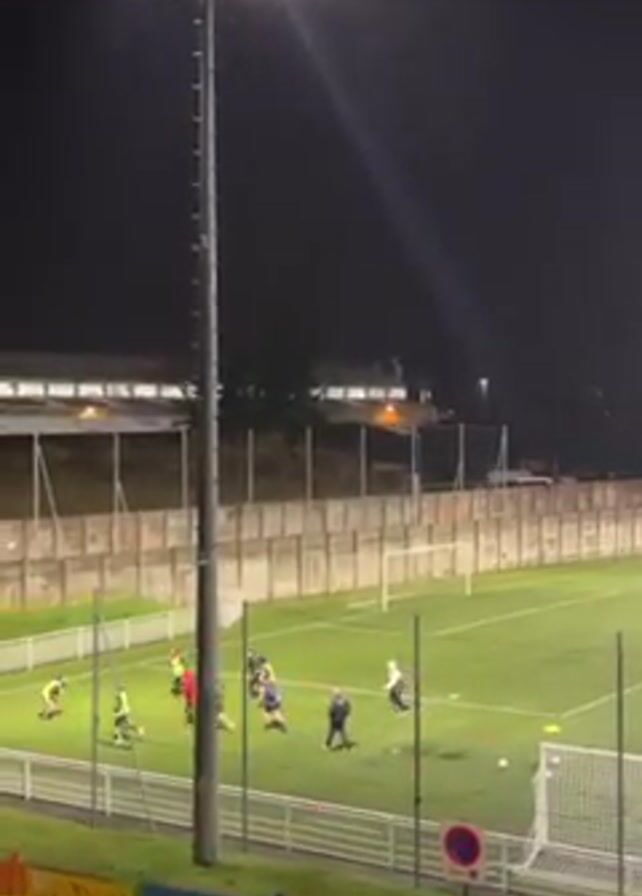 soccer field at night, lit by tall stadium lights. A group of people, likely soccer players, are practicing on the field. They are wearing different colored jerseys and are moving around, passing a soccer ball. The field is enclosed by a fence and a wall, part of which is decorated with colorful murals. In the background, there are buildings. The camera is positioned slightly elevated, looking down onto the field. It is raining.