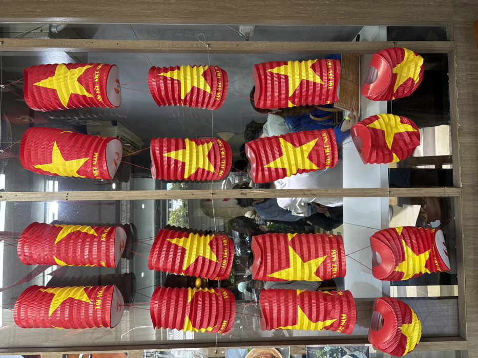 A grid of red and yellow cylindrical lanterns hangs in a display case. Each lantern is decorated with a yellow star on a red background, resembling the flag of Vietnam, and features the text "TUI YEU VIET NAM." The lanterns are ribbed in a corrugated fashion. Reflections in the glass reveal glimpses of the surroundings and people outside. The lanterns appear to be a decorative or cultural item.