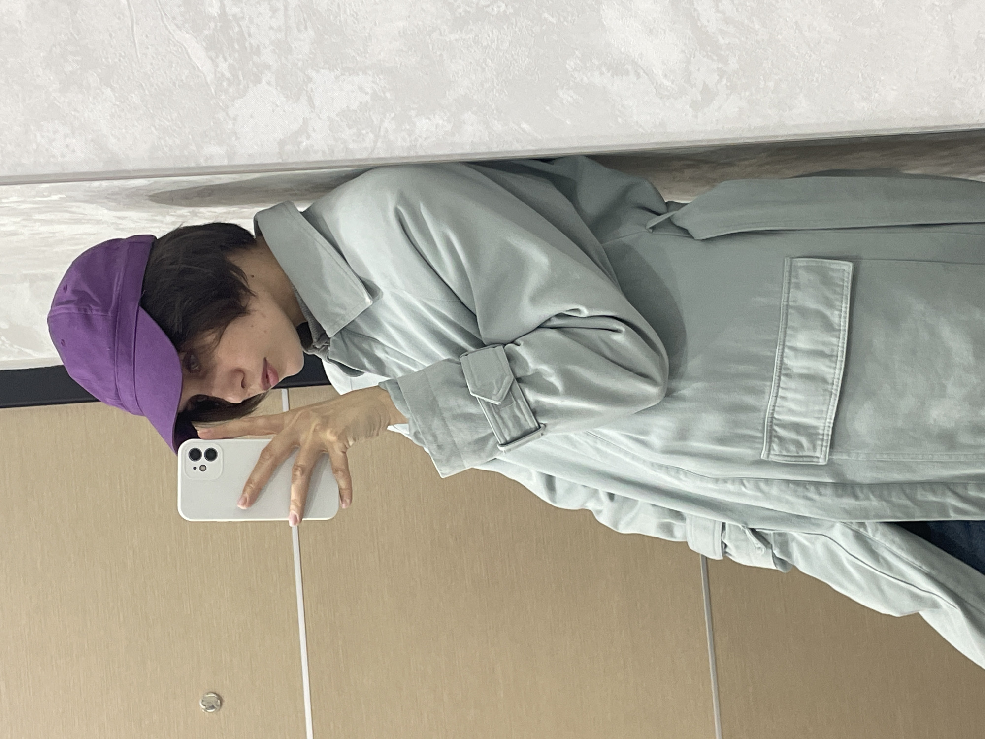 The image displays an indoor mirror selfie featuring a single individual. The person, characterized by short dark hair, wears a purple baseball cap, a pale green long-sleeved collared jacket with cuff straps and two visible flap pockets, and a grey turtleneck underneath. The individual's right hand holds a white smartphone, positioned to capture the reflection. The person is leaning against a light grey wall with a subtle textured or marbled pattern, which occupies the right side of the frame. To the left, a light brown, possibly wooden, panel or door is visible, featuring a silver-toned peephole and a horizontal white decorative strip. The specific location within Izhevsk, Russia, is not discernible from the visual information provided.