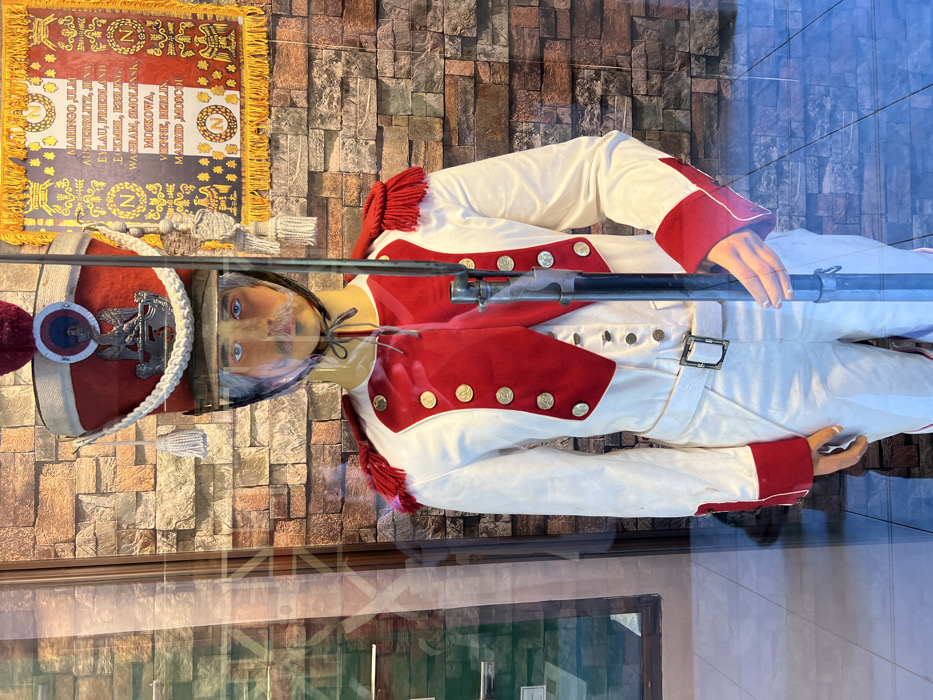 A mannequin dressed in an early 19th-century military uniform stands on display. The uniform consists of a white coat with red accents, gold buttons, and a tall red and white hat adorned with a pompom and a metal insignia. The mannequin is holding a rifle. Behind the mannequin is a wall with a brick pattern. To the left is a banner with the letter "N" surrounded by a laurel wreath and names of battles like "MARINGO, ULM, AUSTERLITZ, etc."