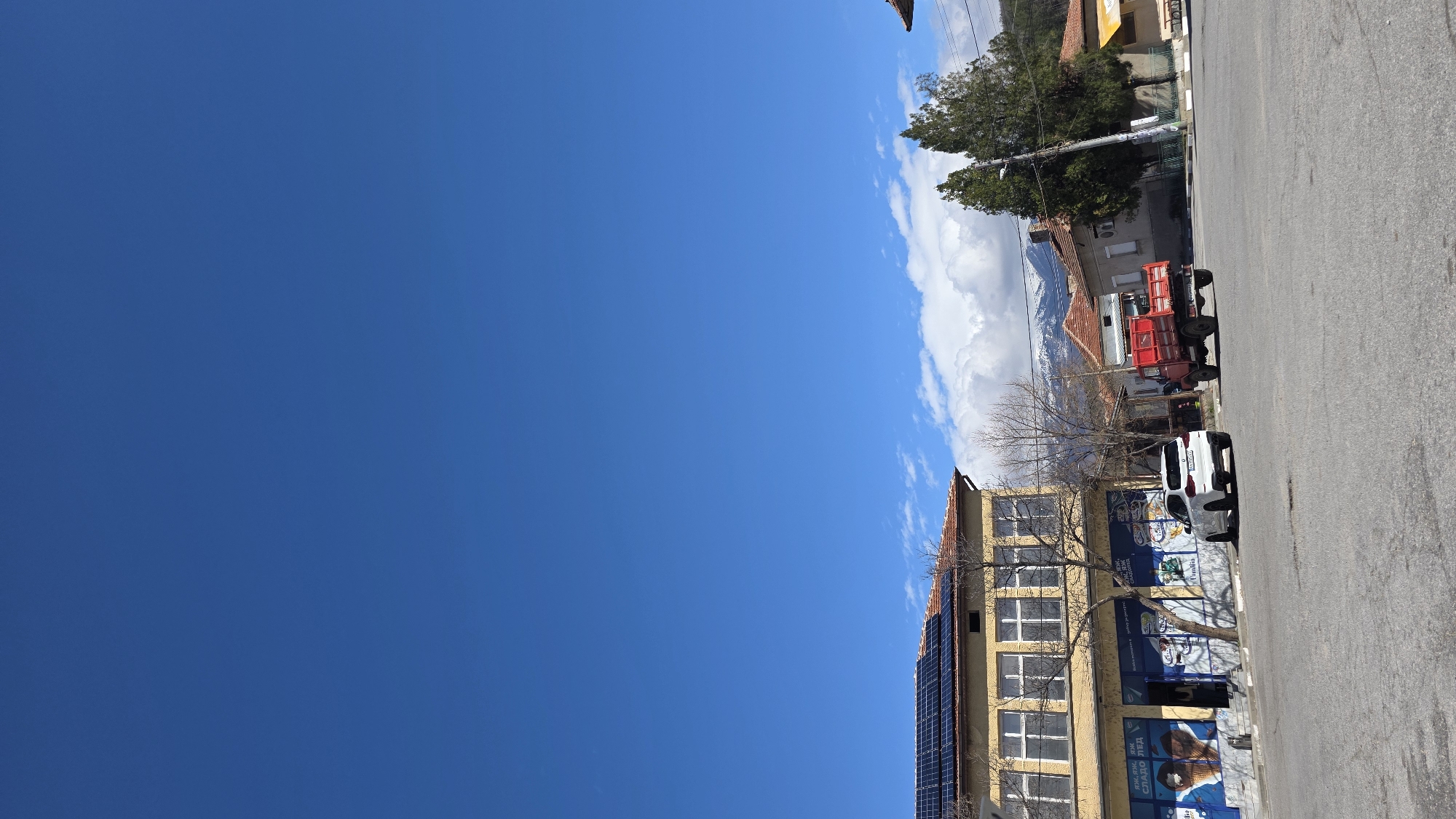 The image captures a street view in Slatino, Bulgaria, featuring a clear blue sky on the left. On the right side of the frame, there is a street with parked vehicles: a white SUV and a red tractor. A two-story building with solar panels on its side is situated along the street. The building's facade displays advertisements. In the background, there are houses, trees, and mountains partially obscured by clouds.