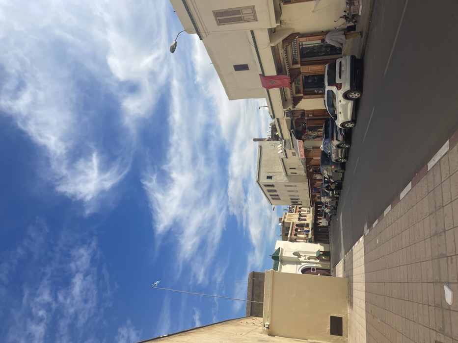 The image displays a street scene within Mechouar Fes Jdid, Morocco, under a bright blue sky with scattered white cirrus clouds