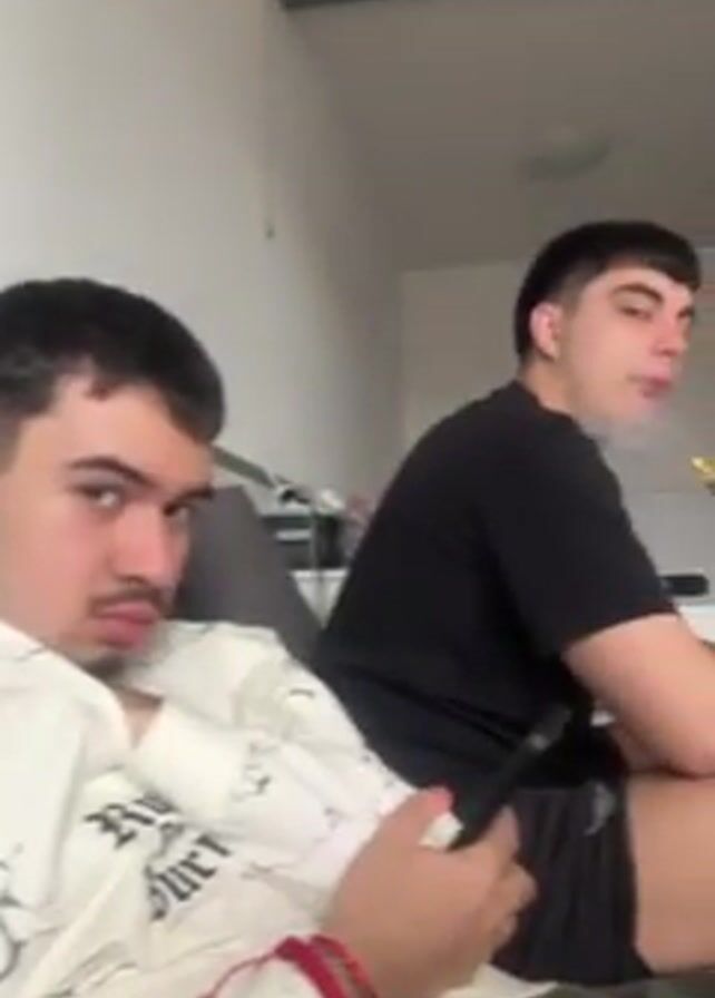 two young men sitting on a gray couch in what appears to be a living room. One man is wearing a white patterned robe and holding a phone. The other man is wearing a black t-shirt and shorts. A white wall with a framed glass section is behind them. At one point, the man in the robe moves the camera closer, focusing on his face, showing an expressive wide-eyed glance towards the camera.